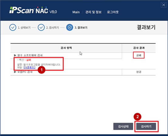기타 메인으로 이동 기타 학교소개 입학안내 대학 대학원 학사안내 대학생활 동아광장 개교80주년 닫기 기타 기타 네트워크 차단 SNS 목록열기 FACEBOOK 공유하기 TWITTER 공유하기 BLOG 공유하기 KAKAO STORY 공유하기 SNS 목록닫기 인쇄 url 복사 NAC 에이전트 설치 단말 – 네트워크 차단1 사용 중 오른쪽 아래의 메시지는 클릭하여 확인 필요2- 교내 필수프로그램 미설치 단말기는 링크를 클릭하여 설치- 불법 소프트웨어가 설치된 단말기는 프로그램 삭제- 설치 및 삭제 완료 이후 검사하기 버튼을 눌러 검사 결과 ‘성공’ 확인